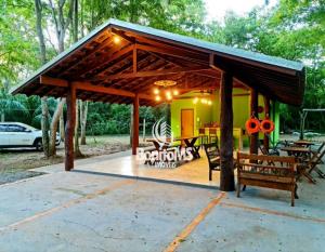 - Infraestrutura: Energia, água, banheiro, quarto, churrasqueira, cozinha caipira, decks e passarela até o rio com uma pequena cachoeira.