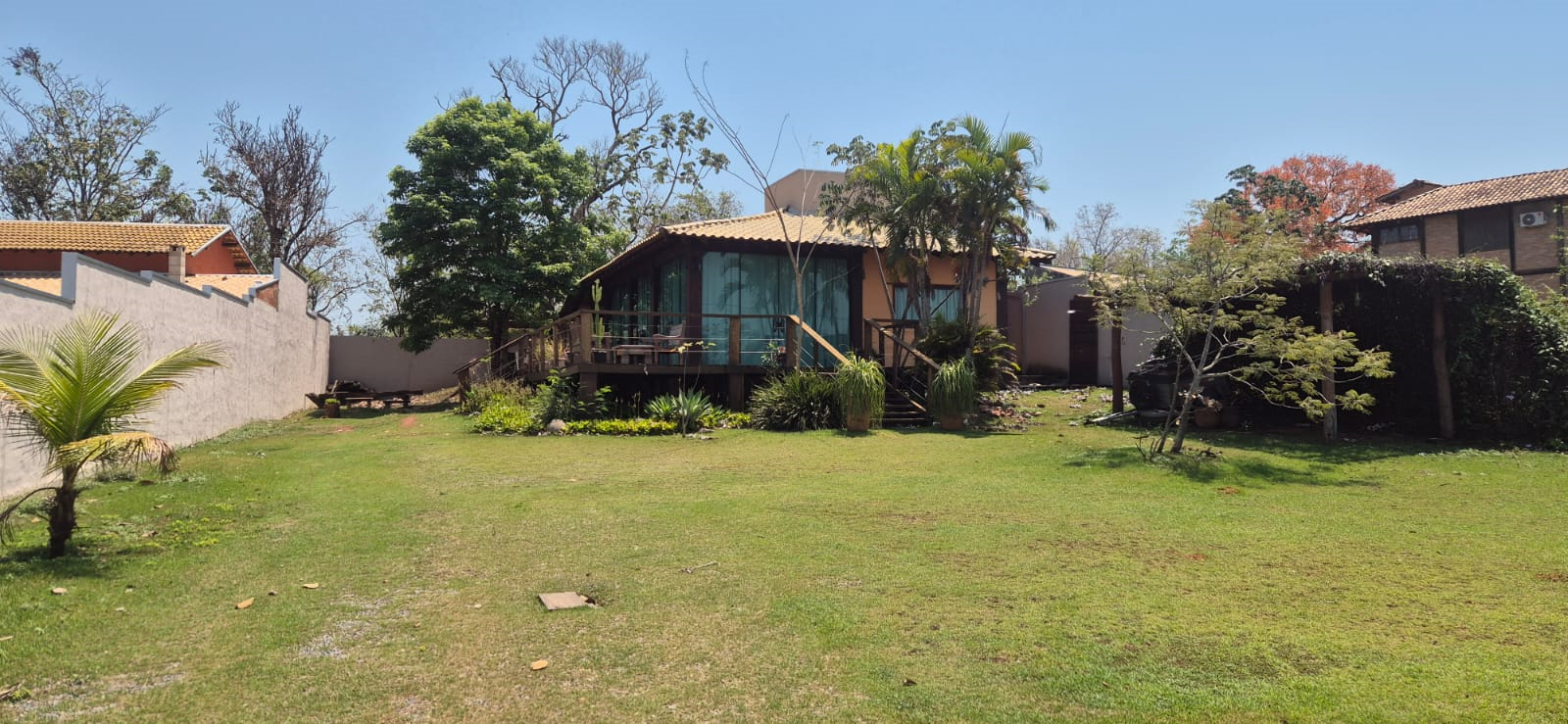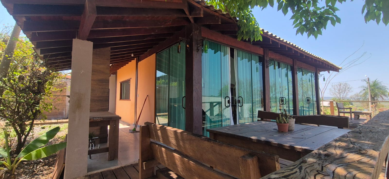 Encante-se com o charme dessa casa com estilo rústico, construída em madeira e vidro, com um lindo deck de madeira